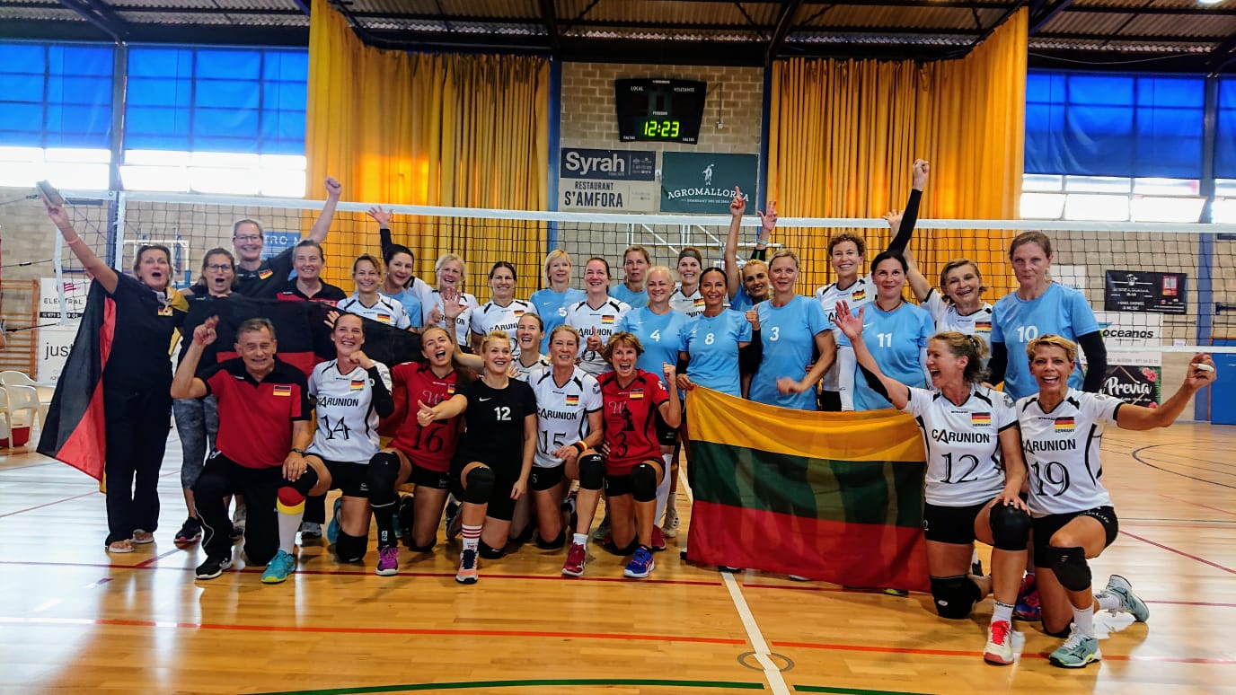 So musste am Samstag das Finale über den Gold- und Silberrang entscheiden. Der erste Satz verlief noch recht spannend und konnte knapp mit 25:23 gewonnen werden. Nach Wechseln auf 2 Positionen und weiteren taktischen Anweisungen von Trainer Michael Wernitz spielten sich die deutschen Damen mit Birgit Miller als Libera auf dem Feld regelrecht in einen Rausch und konnten den zweiten Satz klar mit 25:9 für sich entscheiden. Damit war klar: Gold für die deutschen Ü50-Damen!