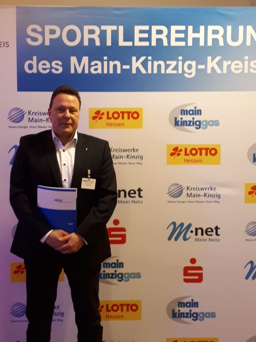 Landrat Thorsten Stolz und Stefan Bahn zeichnen Jörg Heim bei der Sportlerehrung des Main - Kinzig Kreises mit goldener Ehrennadel und Urkunde aus!